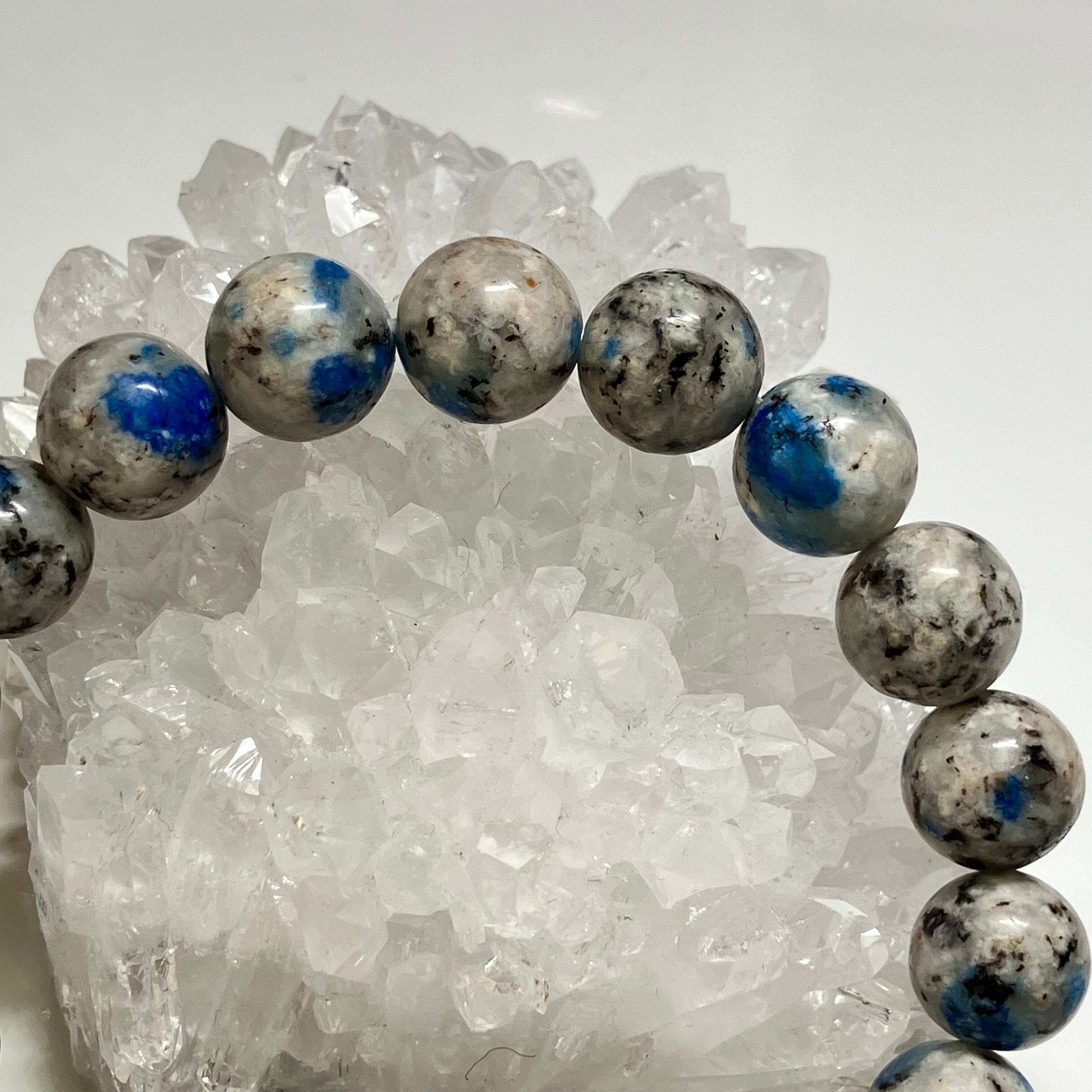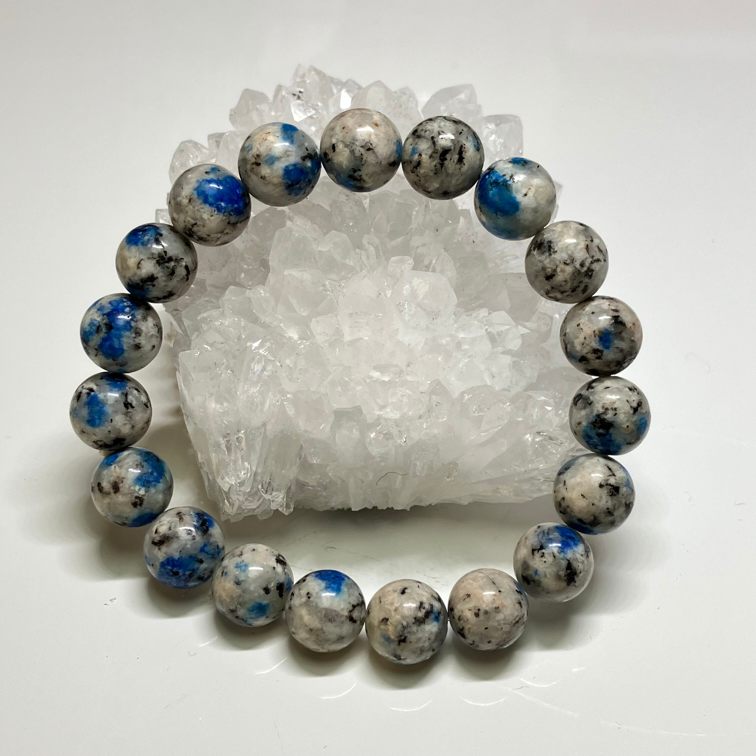 灰色の地色に青色の斑点が特徴的な石で、灰色部分は花崗岩(グラナイト)、青色部分は藍銅鉱(アズライト)で構成されています。